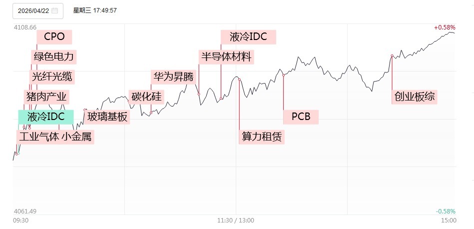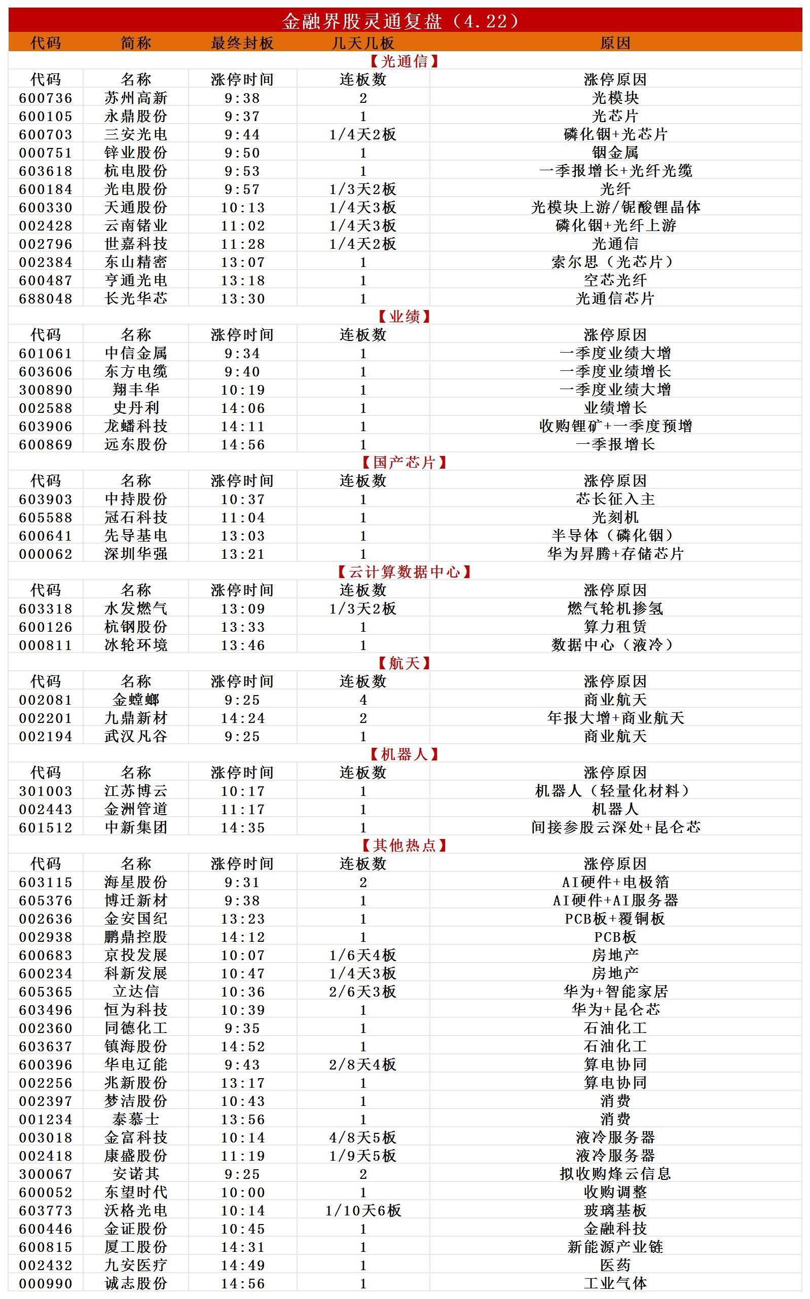 4月22日,市场低开高走,沪指重返4100点。创业板综指创历史新高配资平台排名,突破2015年6月3日的高点。今日市场风格依旧偏向于核心权重趋势抱团,中际旭创再涨超2%离万亿市值仅一步之遥、新易盛涨超7%市值突破6000亿,东山精密缩量涨停续创新高,即使是一季度业绩增速不及预期天孚通信也获得资金的回流,完全修复昨日下跌。光纤概念反复活跃,永鼎股份涨停,续创历史新高,杭电股份封涨停。算力租赁概念持续走强,协创数据触及20CM涨停,宏景科技涨超15%,双双创历史新高,杭钢股份封涨停。