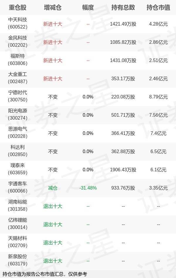 证券之星消息,4月22日华夏基金旗下杨宇管理的华夏能源革新股票型基金公布一季报,近1年净值增长率66.99%。与上一季度相比,该基金前十大重仓股新增中天科技,金风科技,福斯特,大金重工;其中宁德时代持仓占比10.05%,为该基金第一大重仓股;湖南裕能,亿纬锂能郑州配资网站,天赐材料,新泉股份等退出前十大重仓股;详细数据如下: