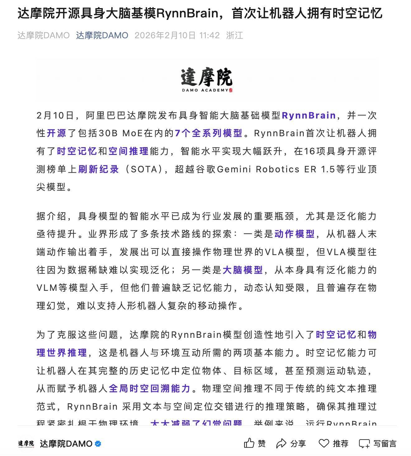 达摩院具身智能实验室负责人赵德丽表示,RynnBrain实现了大脑对物理世界的深度理解与可靠规划,为通用具身智能的发展迈出关键一步。此前,达摩院已陆续开源WorldVLA、RynnEC等具身相关模型,并推出机器人上下文协议RynnRCP,持续推进AI在真实物理场景中的应用探索。