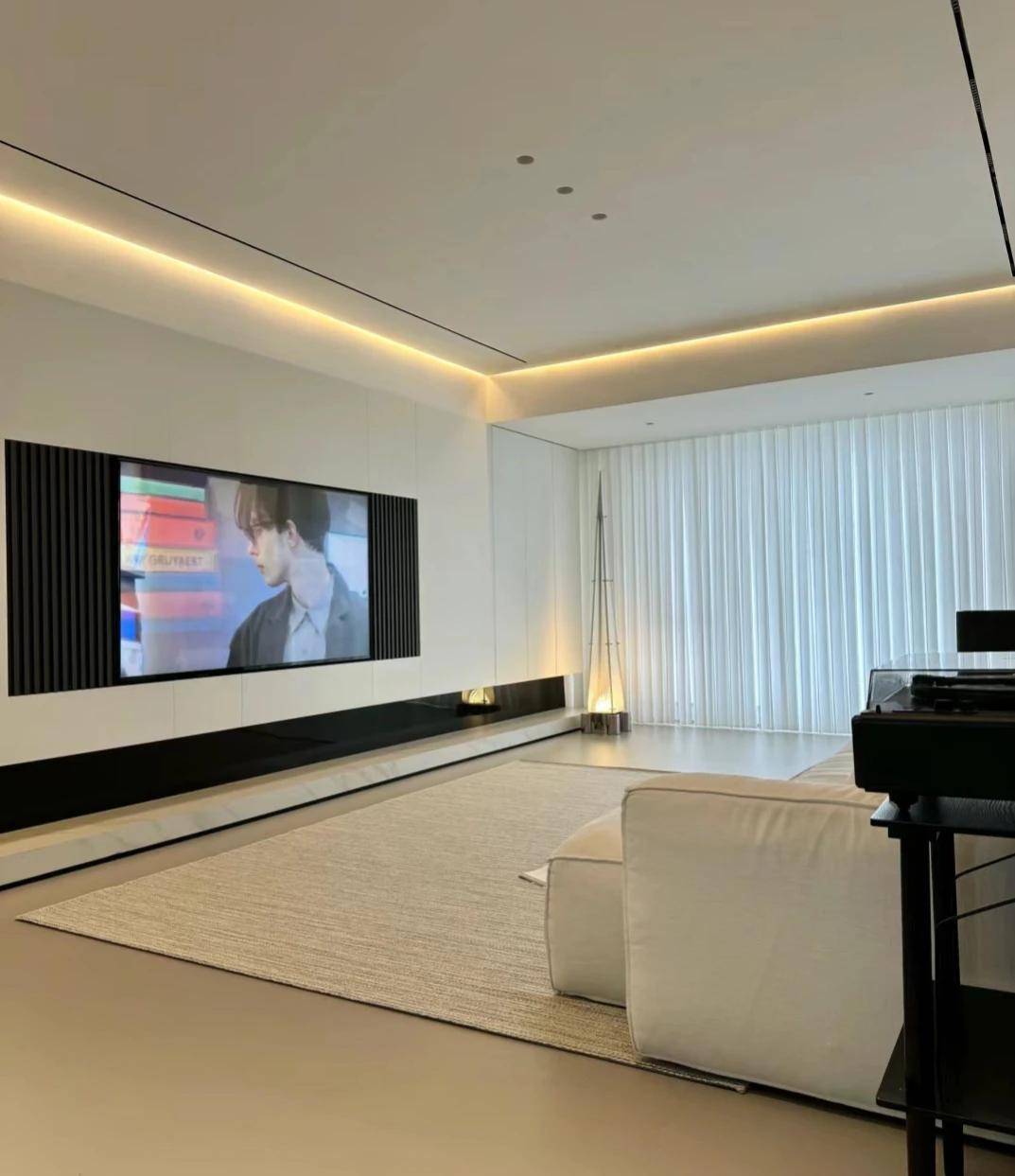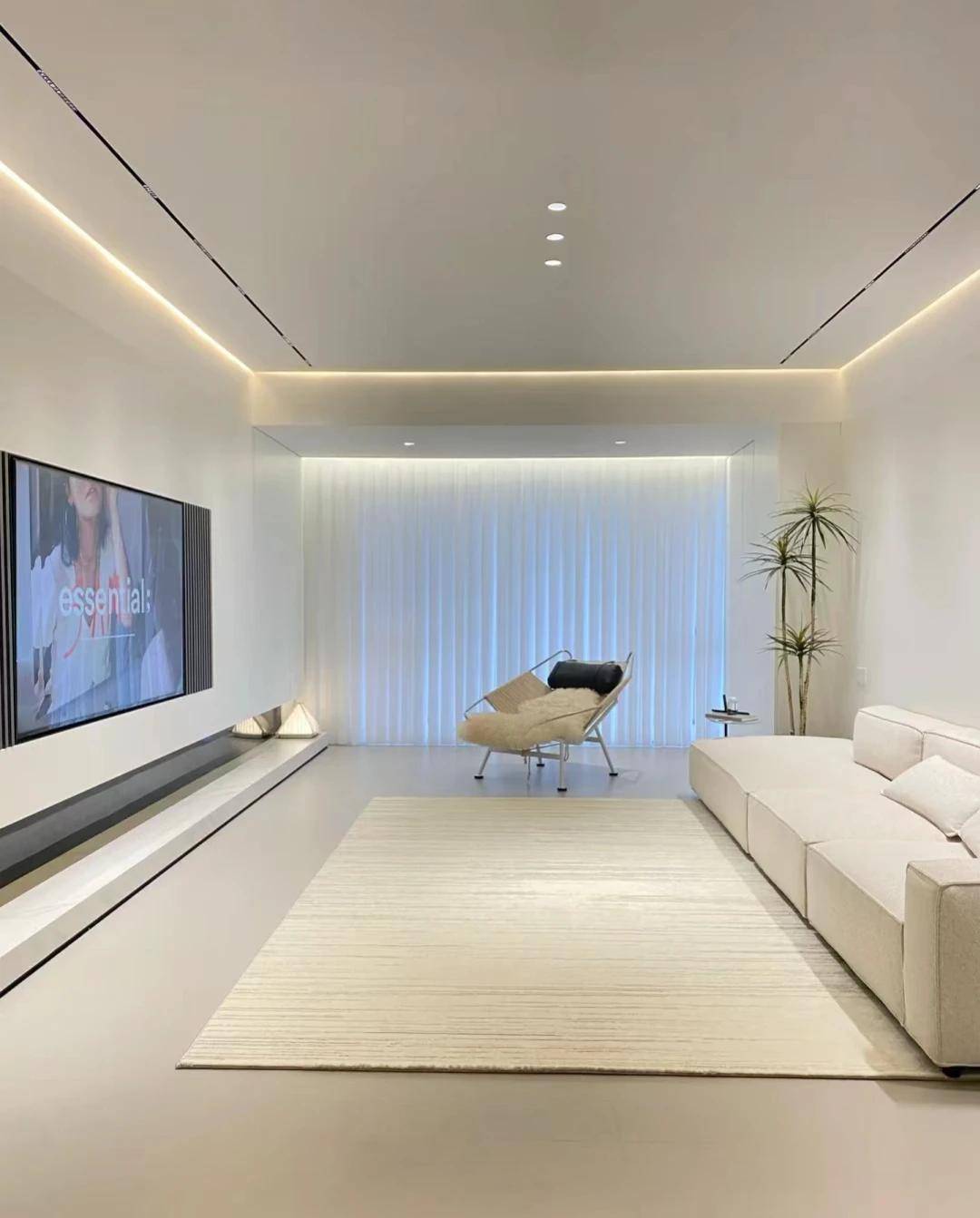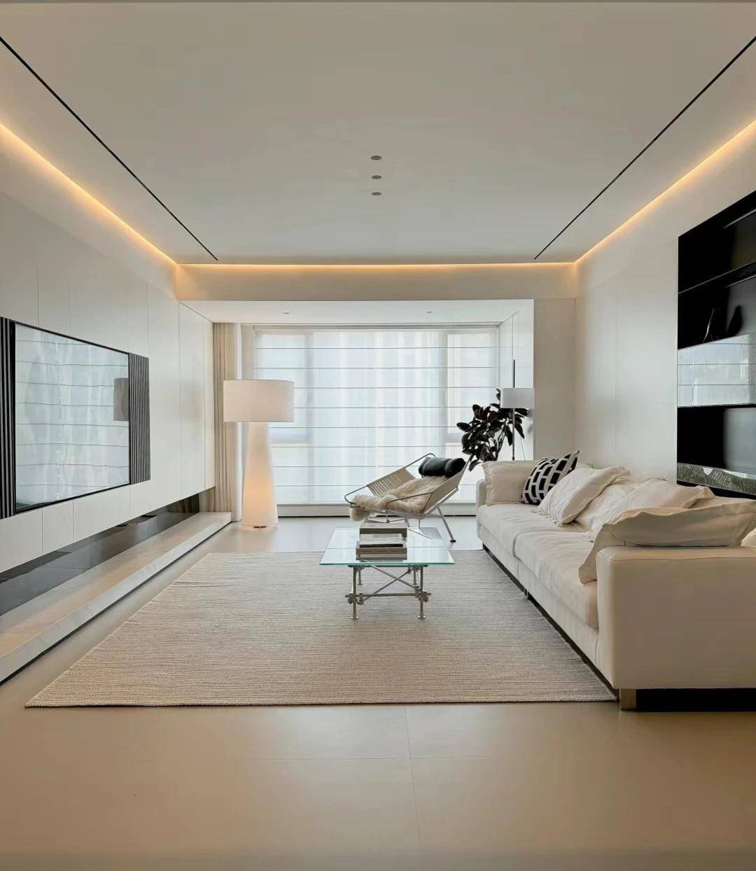 客厅采用无主灯设计,顶面干净整洁,射灯加四周灯带,效果良好。