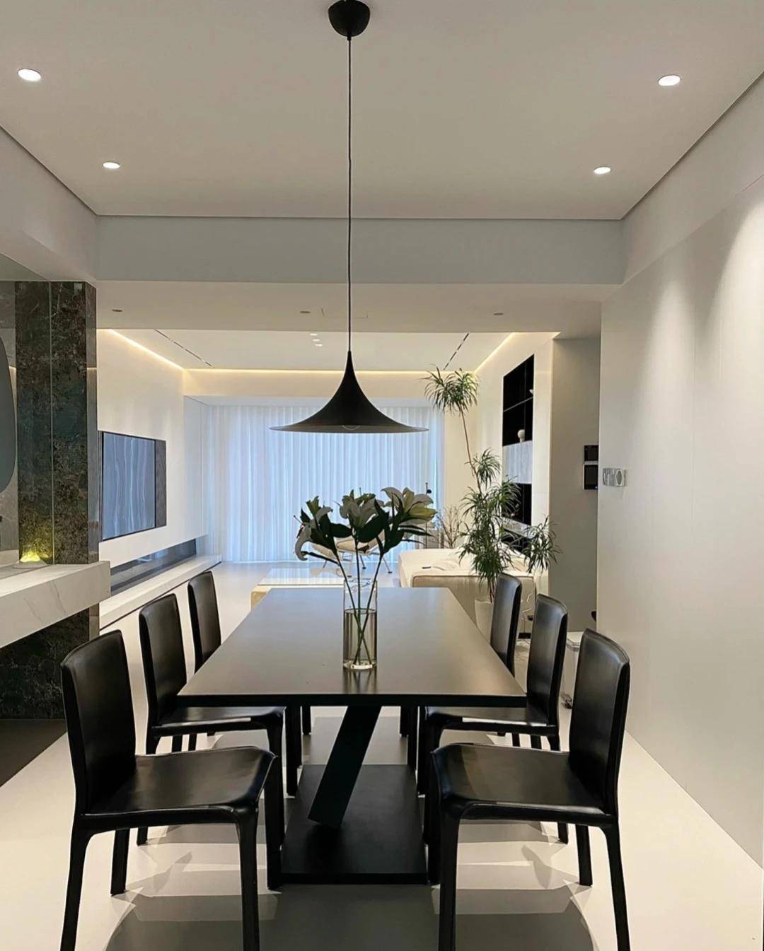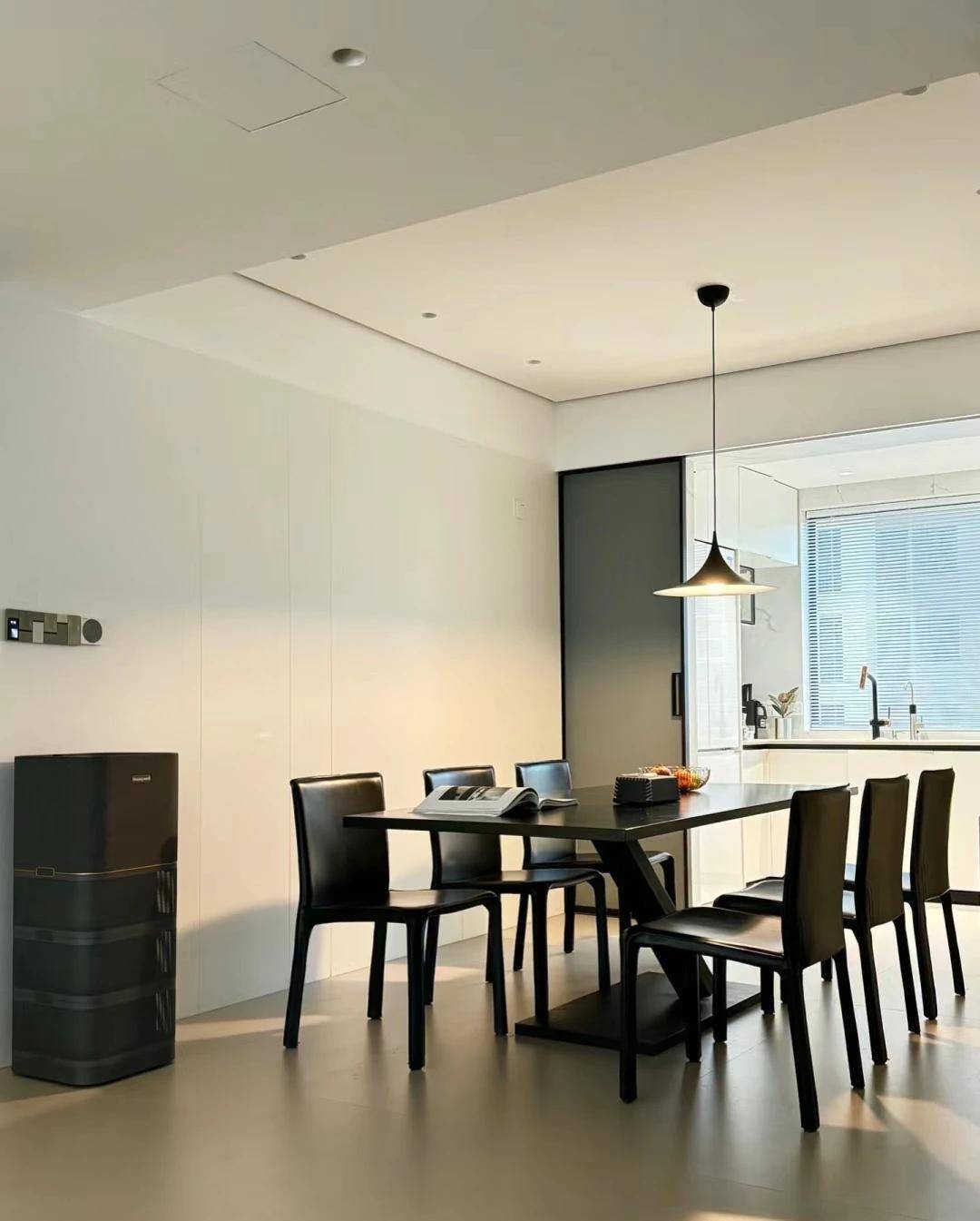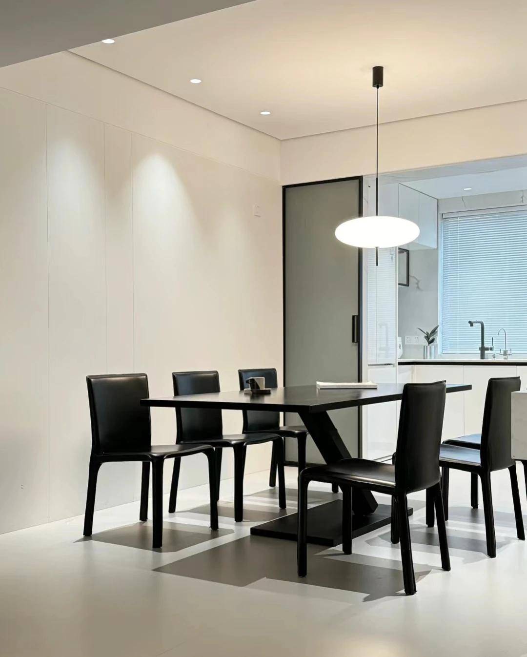 餐厅区域设计大方美观,选择了尺寸为800/1600的方形黑色餐桌,很是耐看。