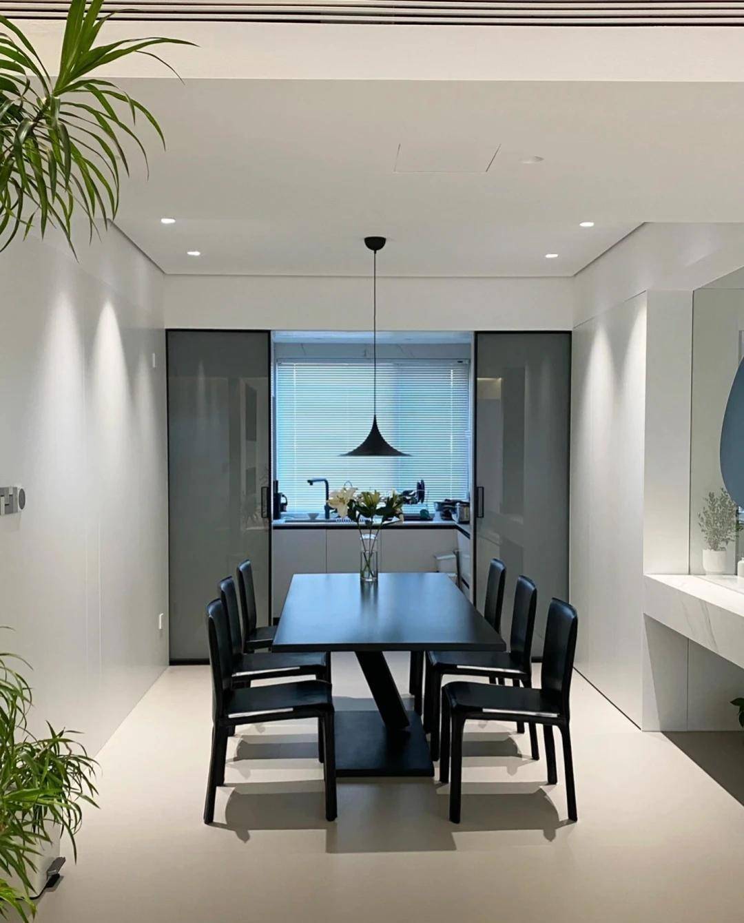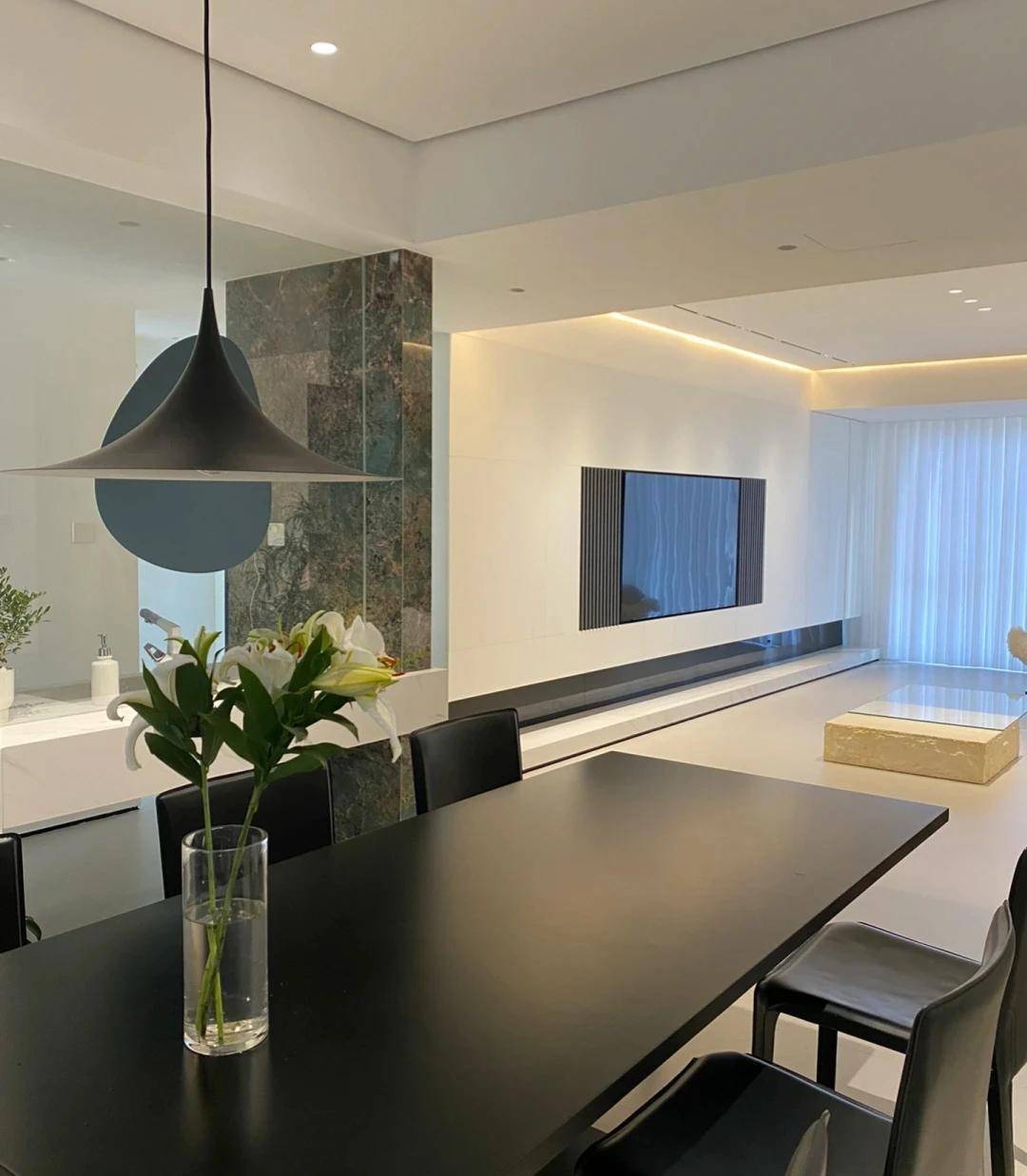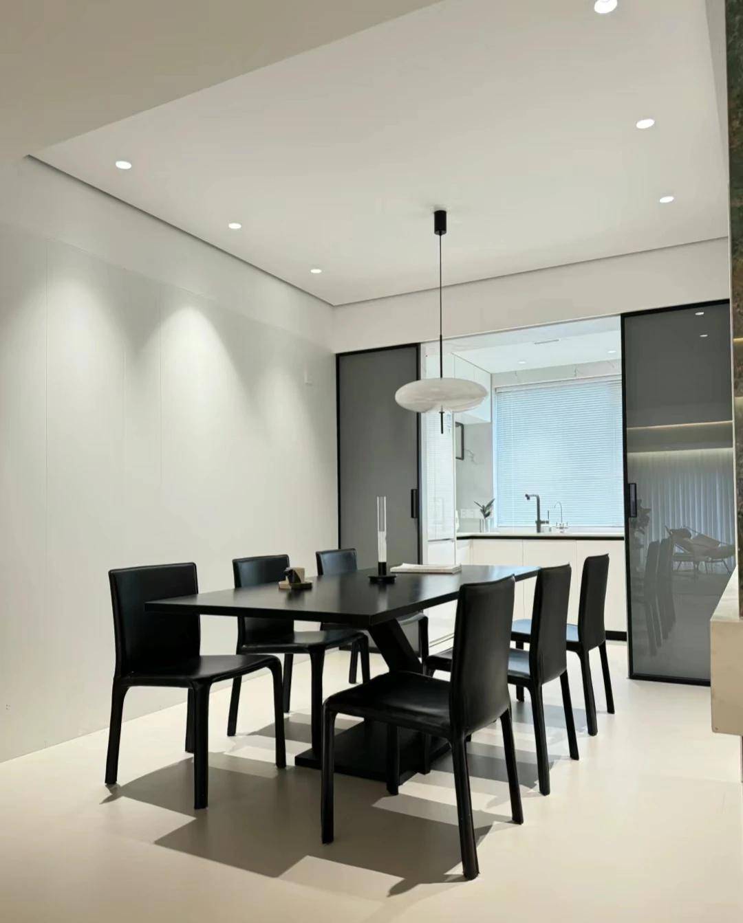 餐厅区域设计大方美观,选择了尺寸为800/1600的方形黑色餐桌,很是耐看。