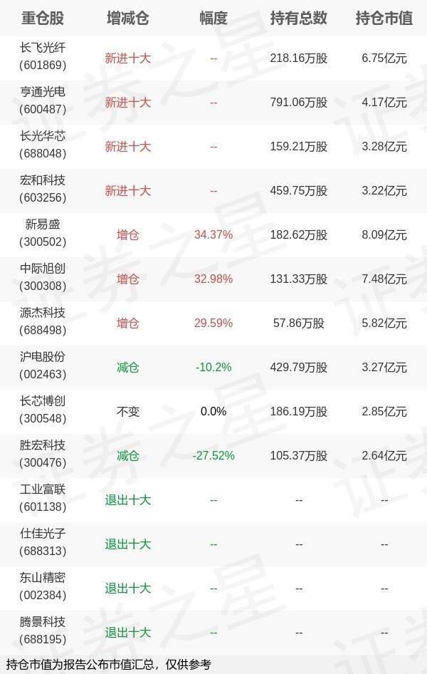 证券之星消息,4月22日华商基金旗下张明昕管理的华商优势行业灵活配置混合型基金公布一季报,近1年净值增长率200.15%。与上一季度相比,该基金前十大重仓股新增长飞光纤,亨通光电,长光华芯,宏和科技;并对新易盛增仓46.71万股,为该基金第一大重仓股;工业富联,仕佳光子,东山精密,腾景科技等退出前十大重仓股;详细数据如下: