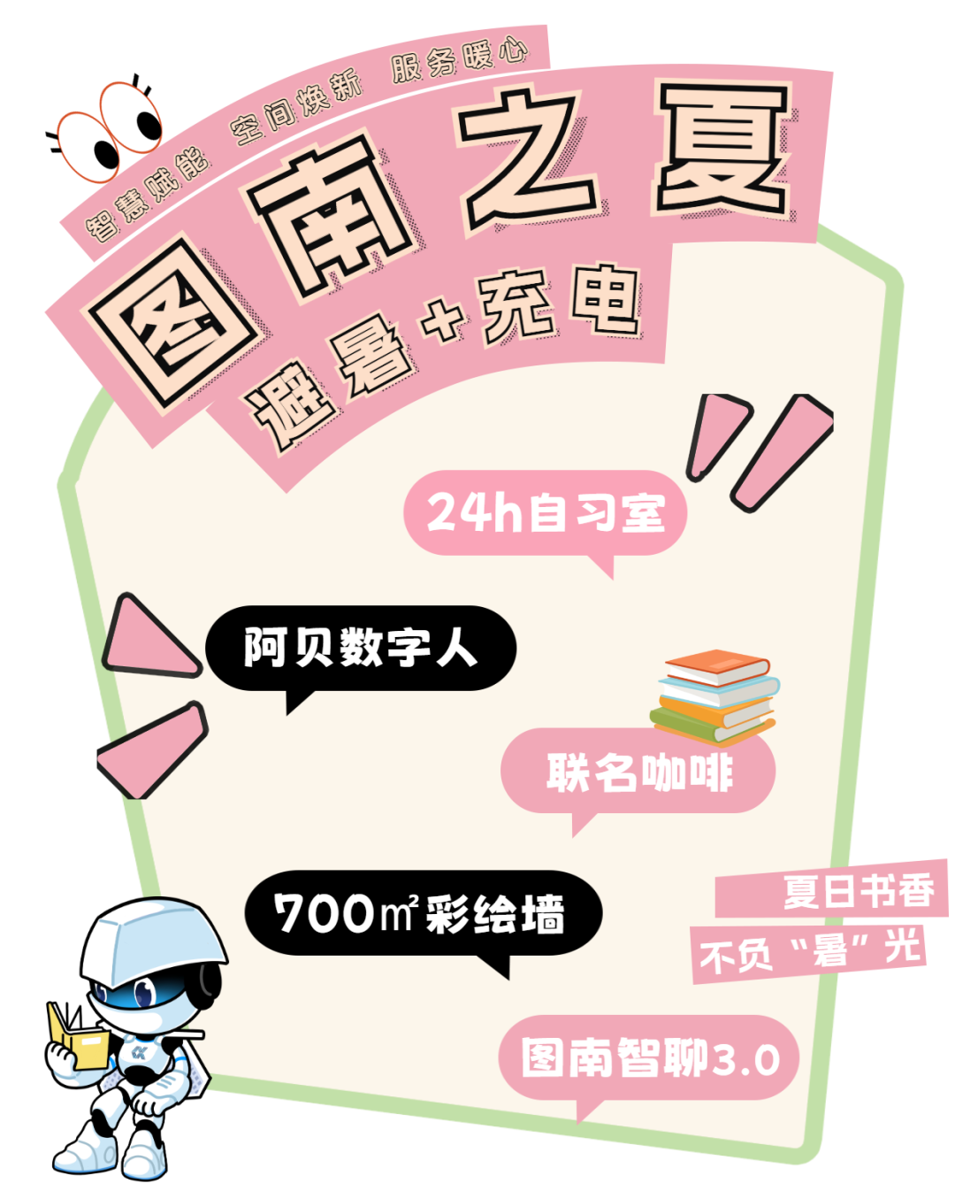 外卖就餐区全面升级,面积座位均增加,并新配备外卖放置架与风扇;3000册新书上架,少儿阅读区服务时间延长及“阅读小铺”移动书车上线。